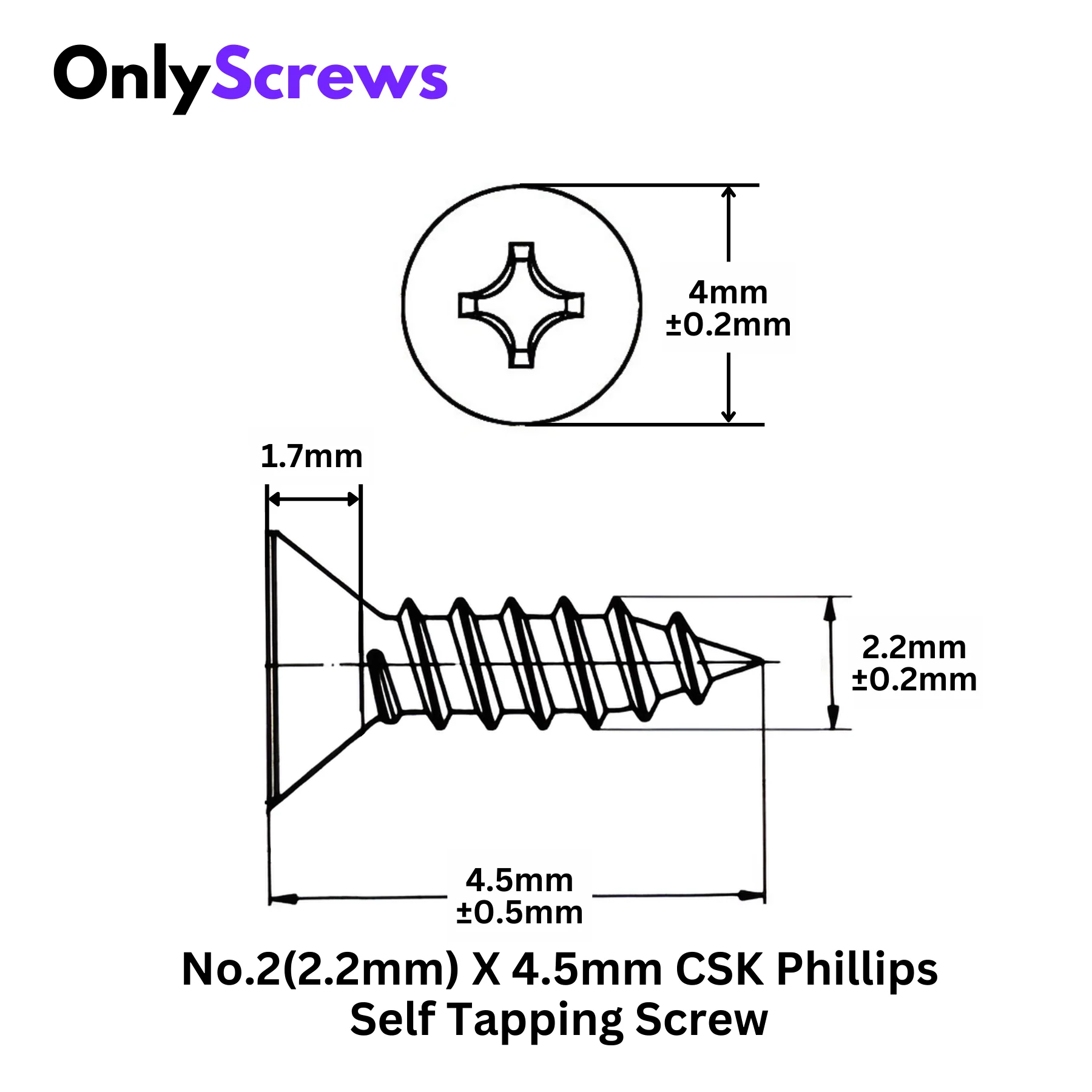The No.2(2.2mm) x 4.5mm Phillips Pan Head Self-Tapping/drilling Screw is 2.2mm in diameter and 4.5mm in length and are designed for  woodworking and other fastening applications. Made from high-quality Mild Steel with Zinc Blue Plating, offers corrosion resistance properties.