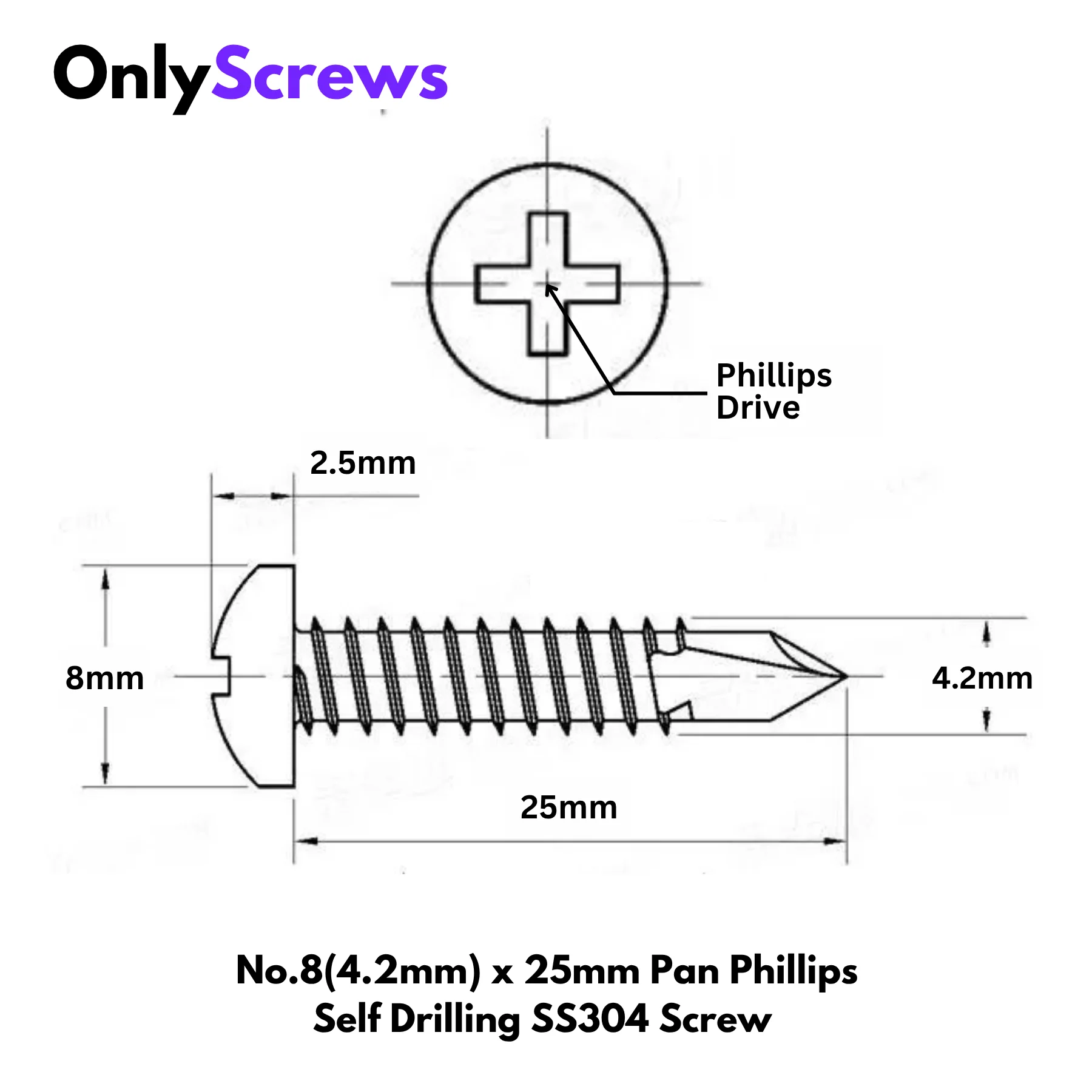 No.8(4.2mm) x 25mm Pan Phillips Self Drilling SS304 Screw (Dia: 4.2mm, Length: 25mm)